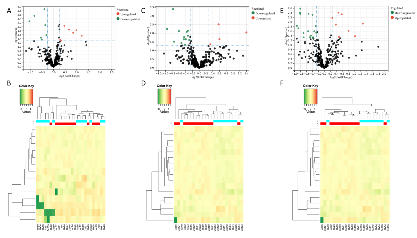 對三組蛋白質樣本進行了PCA分析(圖1)。蛋白質組差異分析用于分析維生素缺乏對補體差異蛋白的影響。如火山圖(A?vs B)所示,隨著維生素D含量的降低,7種蛋白質的表達水平上調,7種蛋白質的表達水平下調(圖2A),如補體因子B(CFB)、原肌球蛋白α-4鏈(TPM4)和可誘導共刺激分子配體(ICOSL)。A組和B組熱圖分析結果顯示兩組之間有很好的分離(圖2B)。