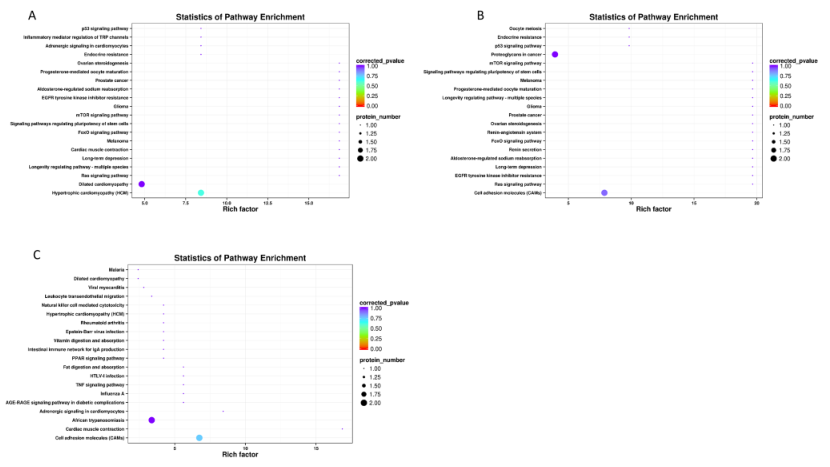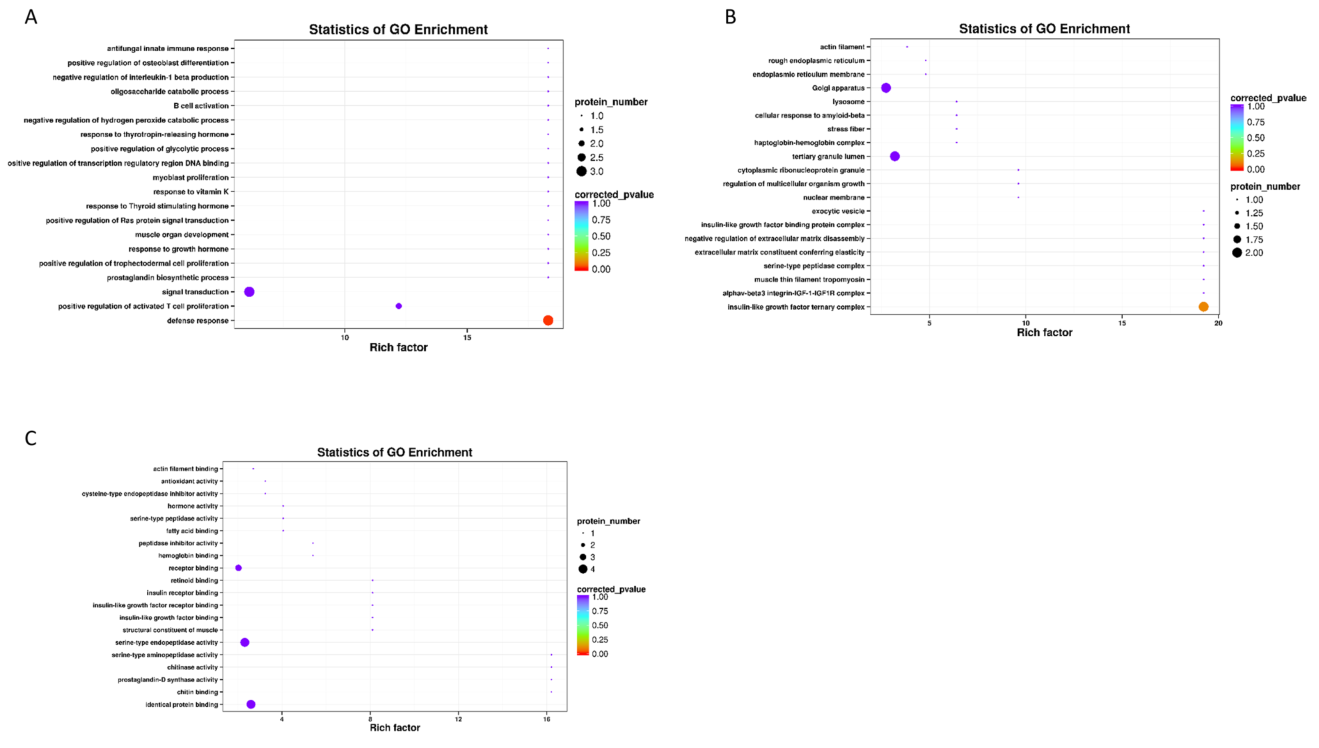 為了進一步探索差異蛋白的潛在功能,我們進行了GO分析。GO功能分析顯示,A組和B組之間差異表達的蛋白質主要與“胰島素受體結合”、“防御反應”、“積極調節活化的T細胞增殖”和“細胞對淀粉樣β蛋白的反應”有關(圖3)。與C組相比,B組與C組差異表達的蛋白質主要集中在“活化T細胞增殖的正向調節”、“胰島素樣生長因子結合蛋白復合體”和“維生素D結合”(圖4,見原文)。與C組相比,A組差異表達的蛋白質主要集中在“防御反應”、“免疫突觸”和“胰島素樣生長因子結合”(圖5,見原文)。這些結果表明,差異蛋白廣泛參與免疫功能和胰島素分泌。