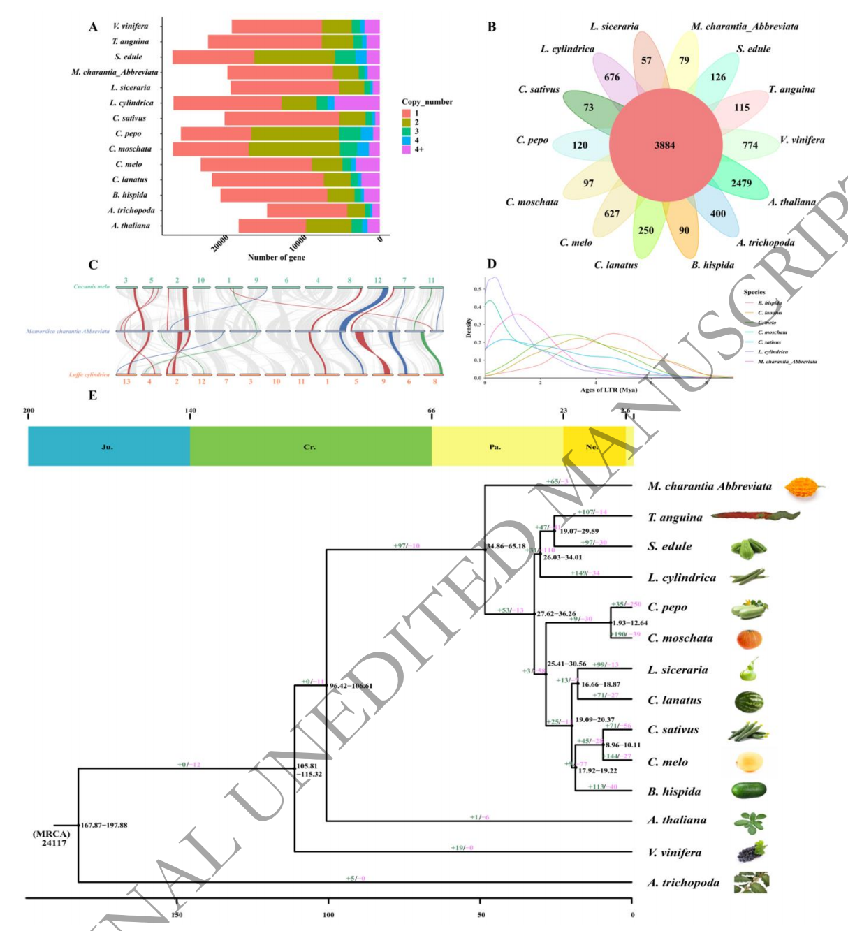 研究顯示,苦瓜在115.08-120.42 Mya時從其他近緣種中分化出來,0.53-52.49 Mya金鈴子與苦瓜發生分化。共線性分析顯示,在甜瓜、絲瓜、‘金鈴子’中檢測到了在馴化過程中對果實成熟和風味形成起作用的幾個共線基因,主要參與植物激素信號轉導、葫蘆素和類胡蘿卜素合成途徑。