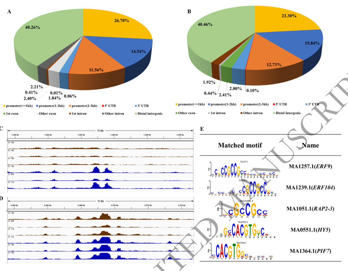 染色質的開放區包含轉錄因子結合位點(TFBS),在轉錄因子(TFs)介導的基因表達調控中發揮重要作用。因此,作者通過對‘金鈴子’三個時期的果實材料進行ATAC-seq分析,以確定在生長過程中差異的染色質開放區域。研究發現,未成熟果實與破色期果實中,6號染色體上存在差異染色質開放區,主要是與類胡蘿卜素途徑和植物激素信號傳導相關的基因;破色期與成熟期果實相比,3號染色體上存在差異染色質開放區,主要的影響基因有乙烯應答轉錄因子WRI1、乙烯應答轉錄轉錄因子ERF118和生長素應答因子1(ARF1)等。