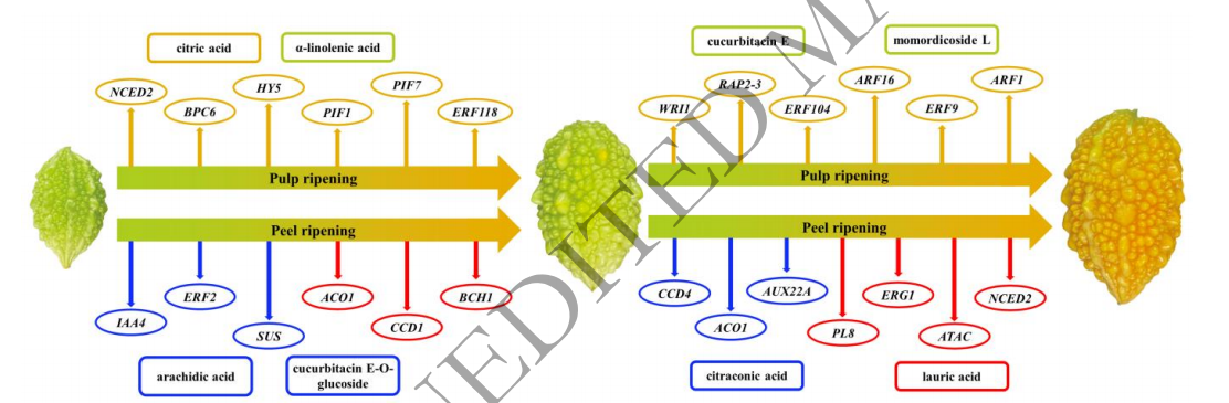 ?為了更全面地了解‘金鈴子’果實的發育成熟過程,作者對‘金鈴子’果實三個不同生長發育期的轉錄組和代謝組進行了系統分析。在果實生長發育前期,共鑒定出515個差異基因和216個差異代謝物,在果實生長發育后期,鑒定出4593個差異基因和376個差異代謝物,這些差異基因和差異代謝物參與調控‘金鈴子’果實生長發育過程中葫蘆素、皂苷、植物激素、氨基酸、脂類、類胡蘿卜素等的生物合成和代謝過程。這些差異決定了‘金鈴子’果實的品質、營養價值以及果皮顏色的變化,為苦瓜基因組研究提供了一個新的遺傳資源。