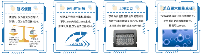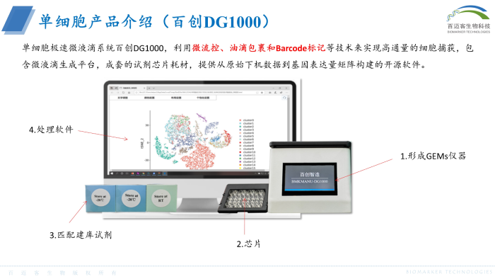 單細胞極速微液滴系統百創DG1000,利用微流控、油滴包裹和Barcode標記等技術來實現高通量的細胞捕獲,包含微液滴生成平臺,成套的試劑芯片耗材,提供從原始下機數據到基因表達量矩陣構建的開源軟件。