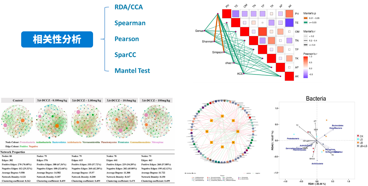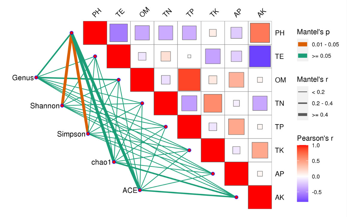 Mantel Test分析:Mantel test 是檢驗兩個矩陣相關關系的非參數統計方法,多用在生態學上,用來檢驗群落距離矩陣(如 Bray-Curtis distance matrix)和環境變量距離矩陣(即環境因子指標)之間的相關性。其可以得到特征與環境因子之間的mantel test的r值和p值。