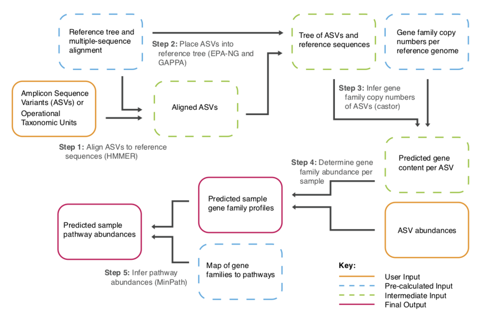 PICRUSt2 (Phylogenetic Investigation of Communities by Reconstruction of Unobserved States)是一款基于樣本中的標記基因序列豐度來預測樣本功能豐度的軟件。這里的功能是指基因家族,如KEGG同源基因、EC酶分類號等,其原理如下圖: