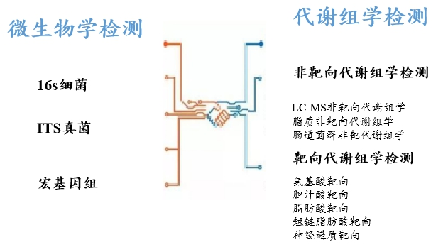 在腸道中,微生物與宿主之間進行密切的信息交流,在代謝、免疫、神經系統調控中起重要作用。不同組成的微生物能影響機體體重、消化功能、抵御感染和自身免疫疾病的患病風險,此外,還能影響機體對藥物的反應。這些腸道微生物主要通過小分子的代謝物與宿主進行密切的相互作用。微生物的代謝組學可發現腸道微生物隨宿主病理生理變化的關鍵代謝物,為微生物組-宿主互作機制研究提供線索。通過微生物組+代謝組聯合分析,可以對微生物與代謝物之間的相互關系進行研究,如微生物菌群與其生存環境的關系,代謝物對微生物穩態的影響,菌群改變在復雜疾病中的作用機理,微生物菌群的生理作用與其代謝產物及其代謝功能之間的相互作用關系及微生物菌群參與的多種代謝調控途徑等。在宿主生理、疾病病理、藥物藥理等方面具有良好的應用前景。