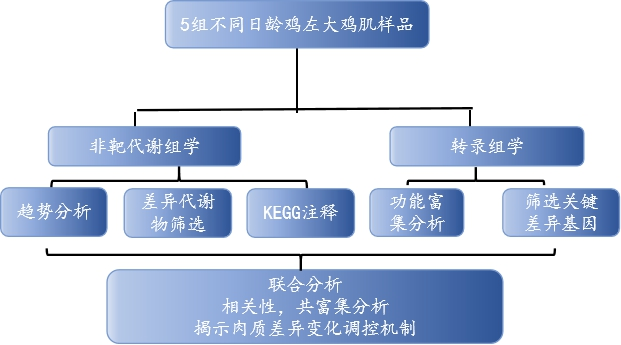 雞胸肉含有不飽和脂肪酸和較低的脂肪、鈉和膽固醇,是大家最喜歡肉類之一。近年來,隨著人們對食品營養價值和自身健康的重視,研究者們開始致力于如何提高肉類質量的研究,而生長時期是影響雞肉質量的重要因素,但不同時期哪些特定代謝物積累是影響雞肉品質的關鍵還不清楚。本研究使用代謝組和轉錄組技術,確定了特定代謝物積累的關鍵基因,有助于了解肉類質量發展下的生物過程,并探索特定代謝物積累的有價值的生物標志物。