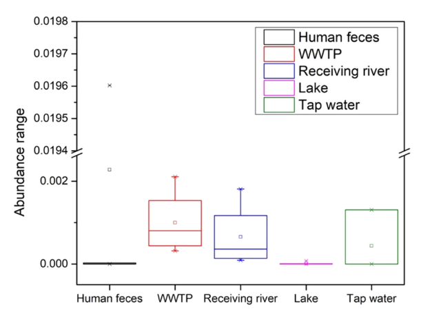 借助人類糞便指示劑 crAssphage (CPQ_056),分析了人類糞便排放對當地水環境中ARGs的影響。結果表明,crAssphage在所有環境樣品中的檢測頻率為 68.2%,相對豐度范圍為2.68×10-6至1.96×10-2每個16S rRNA基因拷貝(圖2),表明超過一半的水樣(湖水、自來水、污水處理廠和受納河水)被人類糞便污染。與 ARGs 一致,平均crAssphage 豐度也沿著水流從污水處理廠不同處理單元的污水到受納河水再到湖泊水體的順序逐漸減少(圖2)。這再次證明了人類糞便污染從污水處理廠的排放源到接收環境有著隨距離不斷衰減的效應。
