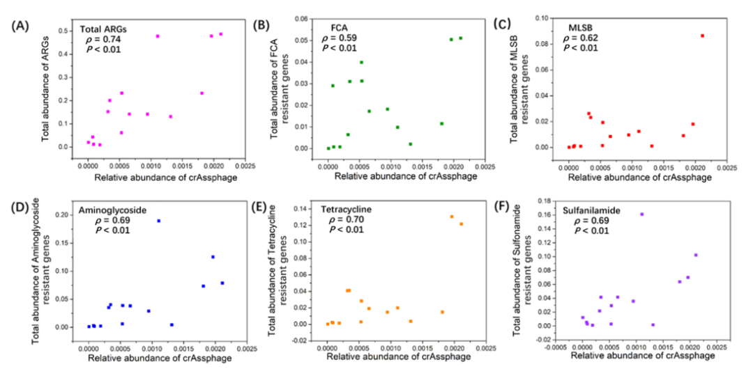 圖3.按目標抗生素分類的ARGs總豐度與水樣中crAssphage豐度之間的相關性