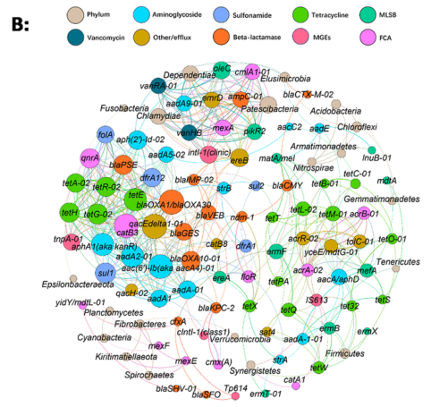 在該研究中,84個ARGs、5個MGES和20個細菌門被用來進行網絡分析(圖6B)。Chlamydiae和Dependentiae 與11種不同的ARG顯著相關,表明它們的基因組中可能含有多種ARG類型。四環素耐藥基因、大環內酯類耐藥基因ermB和氨基糖苷類耐藥基因aacA/aphD是四環素耐藥基因的潛在宿主。Elusimmicrobia可能是aadE、blaCTX-M-02、Olec和vanRA-01的宿主。Synergistetes 可能是tetW、IS613和catA1的潛在宿主。由于該網絡是建立在相關性的基礎上,觀察到的ARGs潛在細菌宿主仍需進一步的試驗驗證。