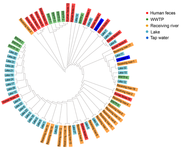 除了crAssphage 之外,研究者通過構建系統發育樹分析了來自所有樣品的氨芐青霉素抗性菌株中的 blaTEM-1基因序列(圖4)。結果表明,來自四種環境樣品(湖水、自來水、污水處理廠和受納河水)的blaTEM-1與腸道樣品的進化關系密切(圖4)。該結果表明blaTEM-1可能通過污水排放在人類糞便和受納水體之間進行傳播。然而,需要進一步的研究來驗證這些發現。