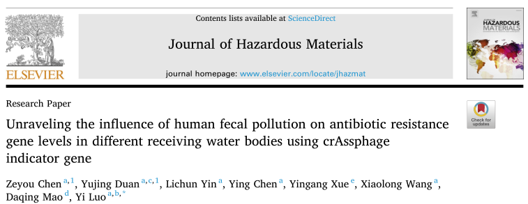 Chen Z, Duan Y, Yin L, et al. Unraveling the influence of human fecal pollution on antibiotic resistance gene levels in different receiving water bodies using crAssphage indicator gene[J]. Journal of Hazardous Materials, 2023, 442: 130005.