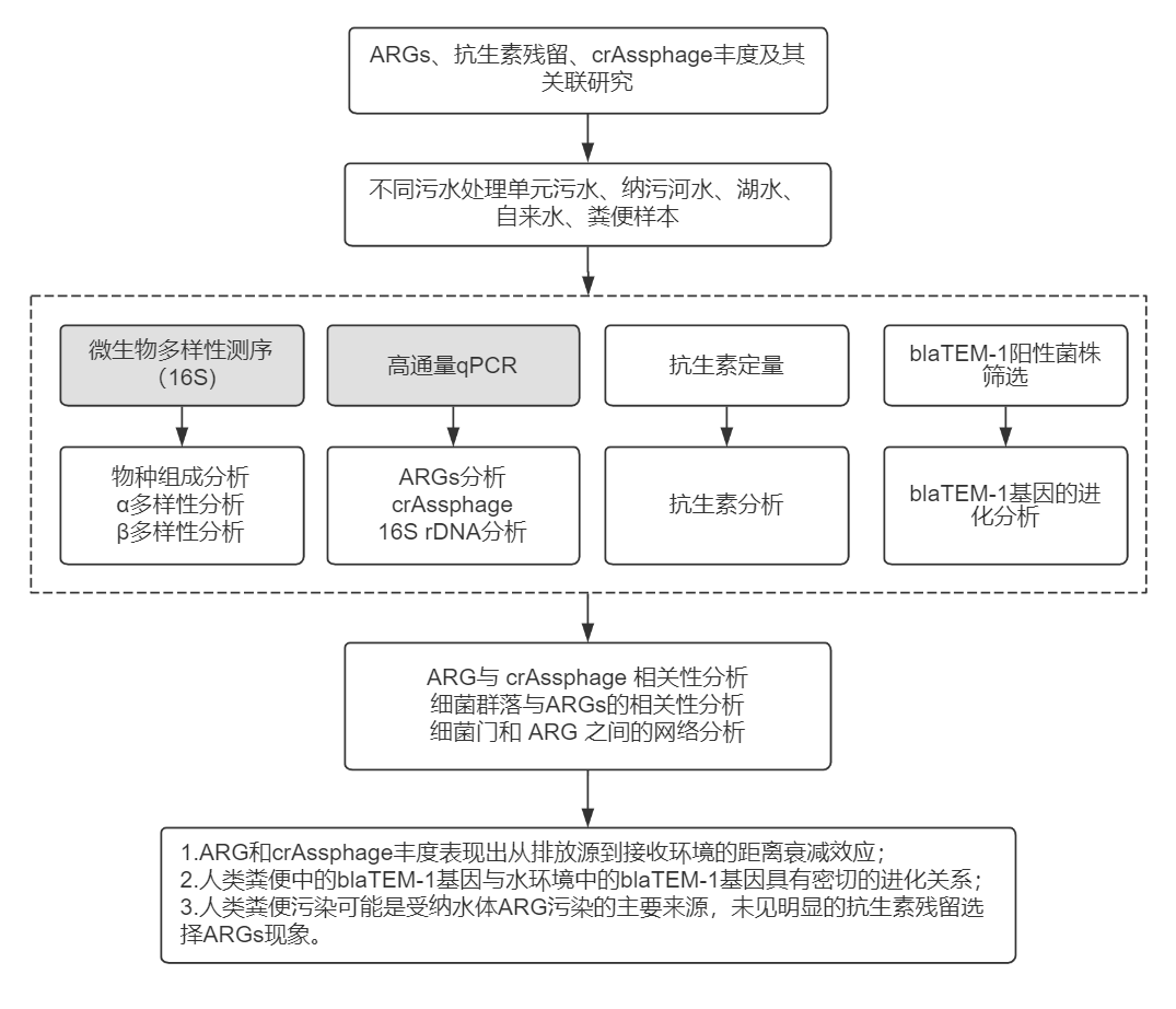 環境中細菌的抗生素耐藥性由于與臨床病原體的抗生素耐藥性密切相關而受到越來越多的關注。自從人類在臨床上使用抗生素以來,環境中的抗生素耐藥基因(ARGs)亦有所增加。然而,這種增加是否直接來源于環境殘留抗生素的選擇性壓力還是來源于人類大量排放的糞便污染卻不得而知。在該項研究中,調查了人類糞便以及受人類糞便污染影響的不同污水處理廠受納水環境中的 ARGs、crAssphage 和抗生素殘留特征,以期了解抗生素的選擇壓力和人類糞便污染對受納水體ARGs污染的影響。