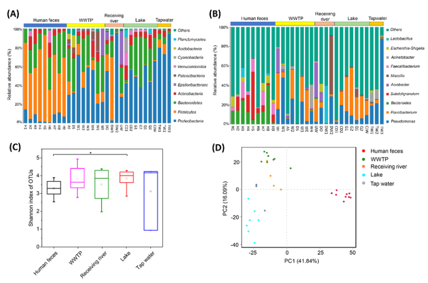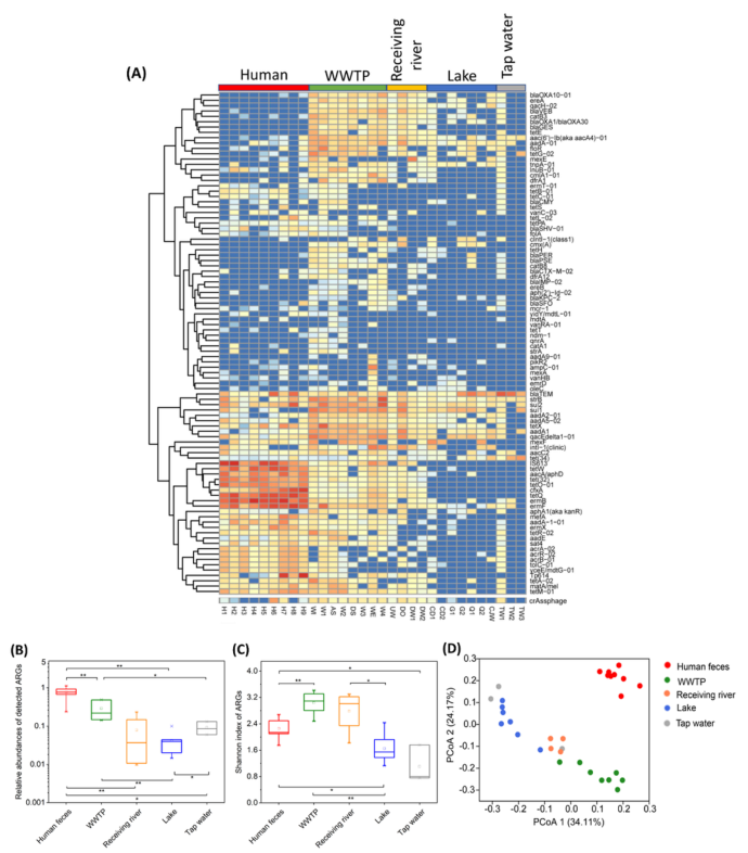 ARG多樣性也隨著水從污水處理廠向自來水的輸送而減少(1C)。所有樣本的ARG譜的PCoA表明,不同類型的樣本包含顯著不同的ARG成分。從環境樣品中分離出人類糞便中的ARGs(圖1D),表明腸道具有獨特的ARG圖譜。這可能是因為與環境相比,腸道的條件不同。來自污水處理廠和受納河水的樣品聚在一起較近,證實了污水處理廠出水的排放對受納河中的ARGs有很大影響。同樣,湖泊和自來水更傾向于聚集在一起,與所研究的湖泊都是自來水水源一致。上述結果表明,在所研究的樣品中普遍存在ARGs,污水處理廠攜帶的ARGs可能污染不同的受納水體。