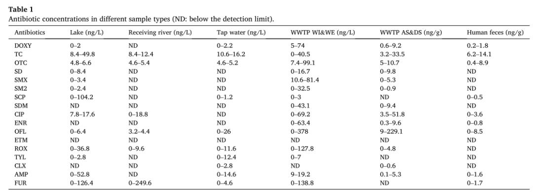 表1.不同樣品類型中的抗生素濃度(ND:低于檢測限值)。