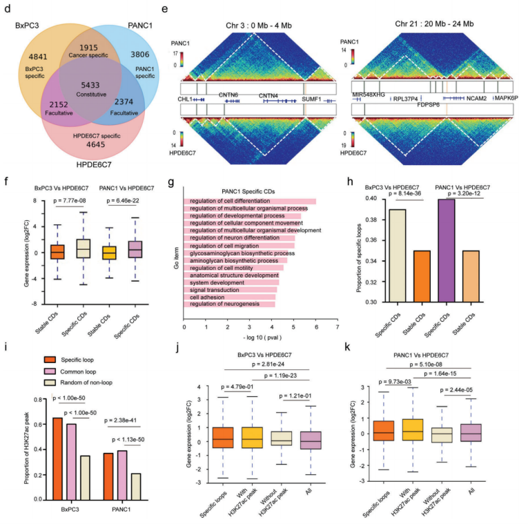 PDAC中的癌癥特異性loops和異常增強子激活深入研究,顯示癌癥特異性loops異常增多,癌癥特異性CD與高比例的癌癥特異性loops顯著相關,這些H3K27ac活性的癌癥特異性loops與上調的基因表達顯著相關。這些變化伴隨著基因表達的上調,可能與癌癥特異性loops中調節元素活性的增強有關。總之,PDAC細胞系中的3D染色質結構經歷了廣泛的重塑,并隨之而來的基因表達失調,這可能會促進PDAC的腫瘤發生和進展。