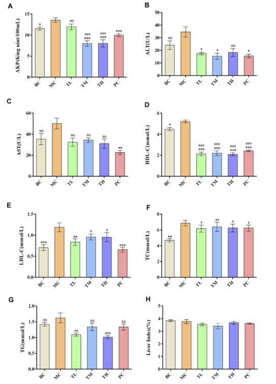 TM組和TH組降低AKP效果優(yōu)于TL組,TG組降低AKP效果優(yōu)于TM組。PC組降低AKP的效果優(yōu)于TL組,但差于TM組和TH組。PC組降低低密度脂蛋白膽固醇的效果優(yōu)于TM組和TH組,表明高脂飼料可導(dǎo)致大鼠血脂和肝酶代謝異常,高脂高脂顆??筛纳聘咧笫笱x和肝酶活性。與陽性藥物相比,HRG在改善高密度脂蛋白膽固醇、甘油三酯、堿性磷酸酶方面具有優(yōu)勢,且改善程度可能呈劑量依賴性。各組間器官指數(shù)無顯著差異,HRG對小鼠生化指標和器官指數(shù)的影響如圖2所示。