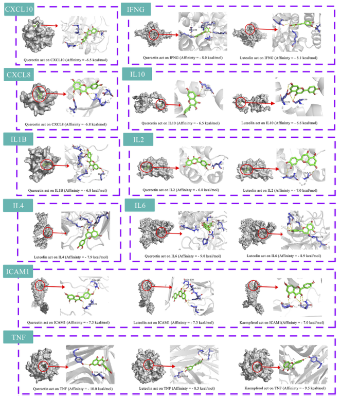 利用10個關(guān)鍵治療靶點、14個關(guān)鍵化合物和相關(guān)通路,通過Cytoscape構(gòu)建了“藥草-關(guān)鍵化合物-潛在靶點-通路”的網(wǎng)絡(luò)圖(圖4H)。排名前三的化合物被選為潛在化合物(槲皮素、木犀草素、山柰酚)。選擇前三個信號通路作為關(guān)鍵通路。繪制了 HRG 通過腸道菌群治療 NAFL 的通路機制(圖 4I)。將10個關(guān)鍵靶點與3個潛在化合物進行分子對接,共獲得18對對接結(jié)果(表4),使用 Pymol 可視化結(jié)果(圖 5)。