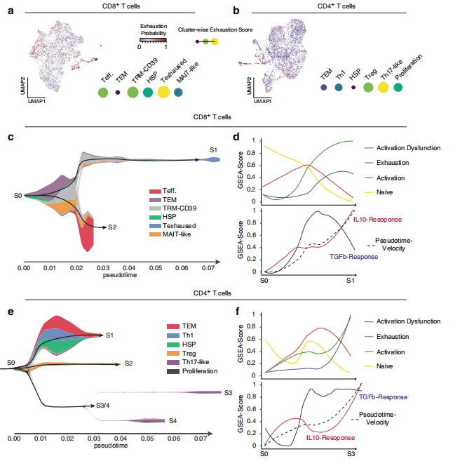 該團隊對?8?名診斷為新發膠質母細胞瘤的患者腫瘤組織樣本進行了單細胞測序和數據分析,發現“S1”狀態與?T?細胞耗竭/功能障礙標志物(HAVCR2、CTLA4?和?PDCD1)的表達增加,為了確定與?T?細胞耗竭相關的轉錄途徑,進行了通路信號傳導推斷,揭?示了?T?細胞耗竭與?IL-10?以及部分?TGF??反應之間存在著相關性。