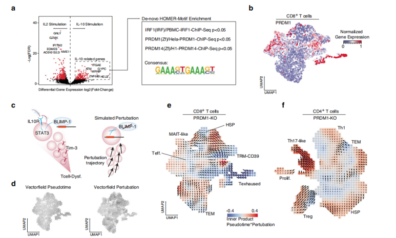 該團隊通過擾動模擬,用IL-10刺激所產生scRNA-seq數據集富集分析推斷常見轉錄因子結合位點,發現ChiP-seq數據中基因BLIMP-1和IRF1峰之間密切重疊,IRF1和PRDM1/14結合位點的顯著富集,提出了“IL10-STAT3-BLIMP-1信號軸可能是腫瘤相關T細胞耗竭的潛在驅動因素”的假設。為了進一步驗證猜想,作者對PRDM1進行了計算機擾動模擬驗證,發現膠質瘤母細胞瘤微環境中髓樣細胞分泌IL-10驅動誘發T?細胞耗竭。