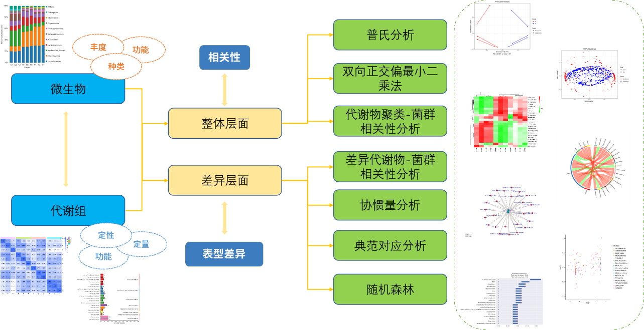 微生物和代謝組聯合分析從兩個層面去進行聯合,整體層面去展示微生物和代謝物之間的整體相關性,比如普氏分析、代謝物聚類-菌群相關性分析;從差異層面則基于不同的差異處理組,去進一步聯系表型關系,看具體的微生物和代謝之間的關系是否與生物的表型差異相關,這里則主要有差異代謝物和菌群相關性分析、協慣量分析、典范對應分析、隨機森林分析等,接下來我們就這些分析和大家具體看下怎么解讀和應用。