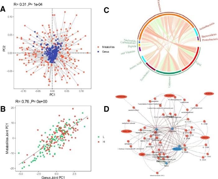 (A) Procrustes analysis (PA):連接兩點的線的長度表示兩個數據集之間樣本的一致性。(B) O2PLS模型:O2PLS模型中具有較大的荷載值,被認為是它們相似性的重要因素。(C) 微生物和代謝物之間的spearman相關性的Circos圖。(D) 不同的代謝物和屬于韌皮部的微生物之間的spearman相關網絡。