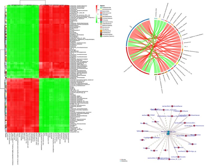 差異代謝物-差異菌群相關性熱圖(左)、差異代謝物-差異菌群相關性和弦圖(右上)、差異代謝物-差異菌群相關性網絡圖(右下)