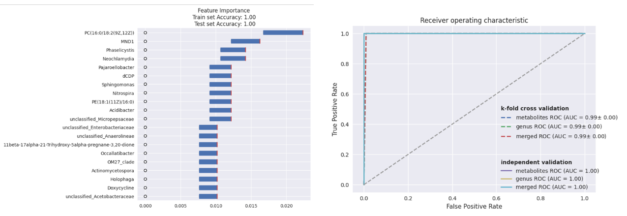 右圖注:虛線顯示訓練集K重交叉驗證的平均ROC曲線,實線顯示獨立驗證的ROC曲線。不同顏色虛線和實線分別表示代謝組、微生物組(屬水平)分別建模以及合并建模的ROC曲線。