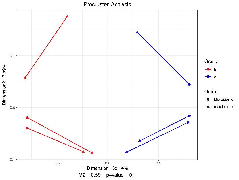 由于兩組數據集的屬性不同,并不適合用來直接比較,可分別對兩個數據集降維排序分析,并提取特征軸的坐標。本分析選用 PCoA 分別對微生物組(屬水平)和代謝組進行降維排序,之后進行Procrustes分析,比較微生物組與代謝組之間的相似和變異情況。