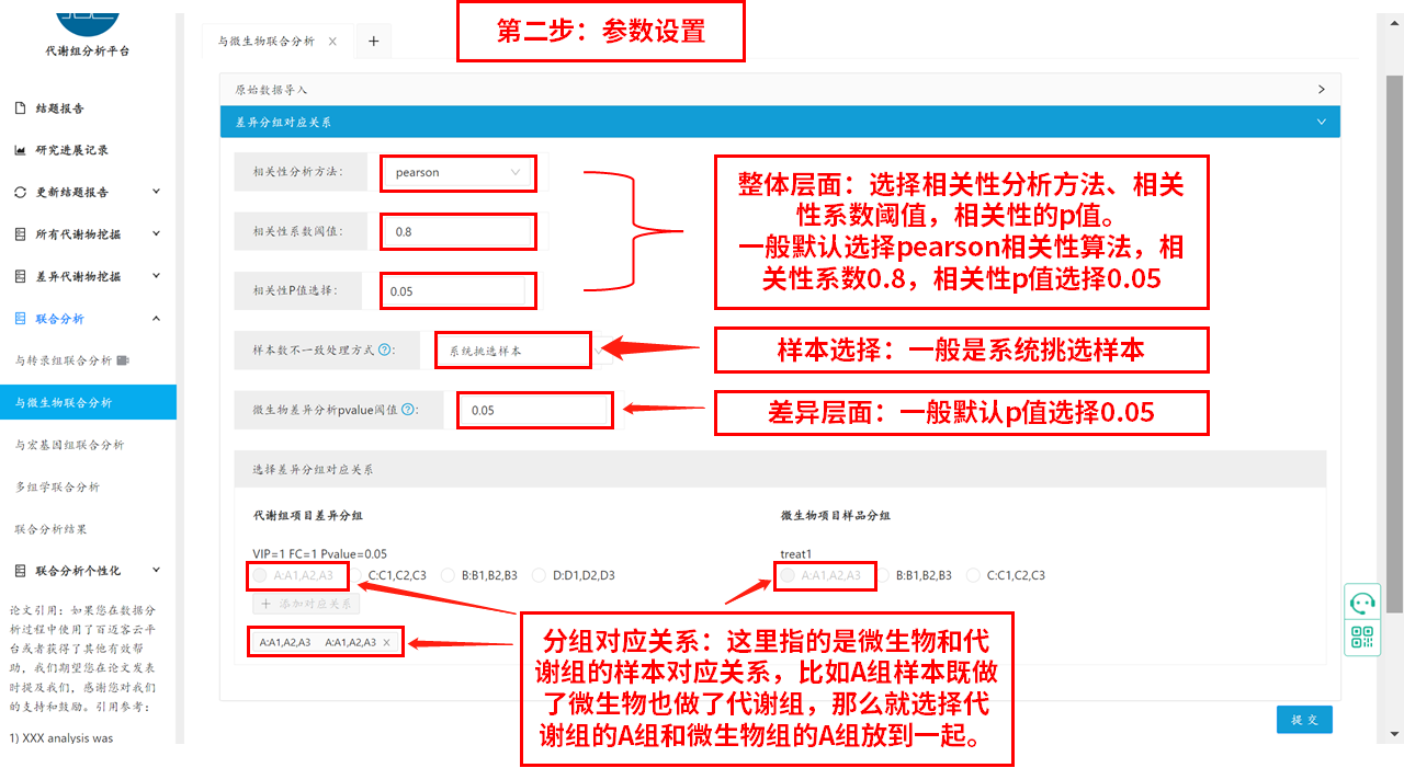 第二步參數設置:整體層面選擇相關性分析方法、相關性系數閾值,相關性的p值。一般默認選擇pearson相關性算法,相關性系數0.8,相關性p值選擇0.05。分組對應關系:這里指的是微生物和代謝組的樣本對應關系,比如A組樣本既做了微生物也做了代謝組,那么就選擇代謝組的A組和微生物組的A組放到一起,具體示例圖如下: