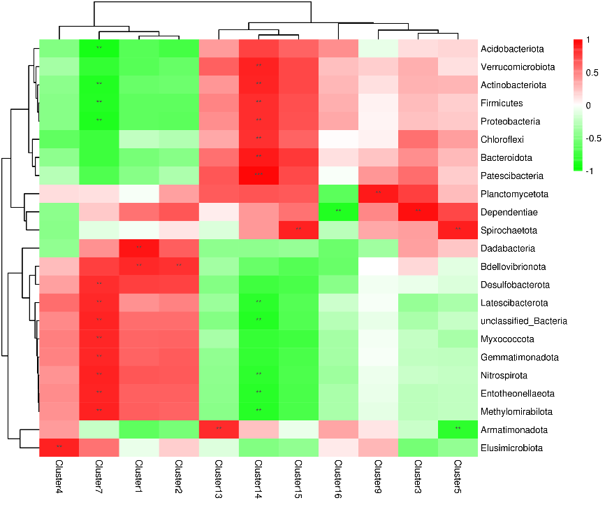 注:圖右側為微生物(門水平),下方為代謝物簇,左側和上方分別為微生物和代謝物簇的聚類樹狀圖。不同顏色代表皮爾遜相關系數的大小,絕對值越接近于 1,相關性越高。紅色表示正相關,而綠色表示負相關。星號表示代謝物簇和微生物之間顯著性相關(p<0.05),*、**和***表示相關性顯著程度依次增強,分別表示 p<0.05,p<0.01和 p<0.001.