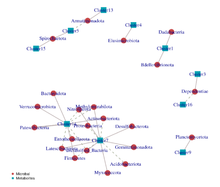 注: 圖中代謝物簇用藍色方形標出,微生物用紅色圓形標出。實線代表正相關,虛線代表負相關。