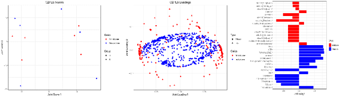 O2PLS 聯合樣本得分圖(左)、O2PLS 模型微生物和代謝物的載荷圖(中)、O2PLS 關聯程度大的微生物/代謝物柱狀圖(右)
