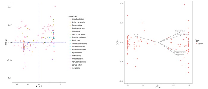 右圖注:圖中的點表示微生物,箭頭為代謝物(為了更清晰的展示代謝物,根據圖幅,統一將箭頭的長度進行了一定比例的縮放),僅展示箭頭長度top5 的代謝物名稱。微生物和原點連線與箭頭形成的夾角反映了代謝物和微生物之間的相關性,銳角為正相關,鈍角為負相關,直角為不相關。