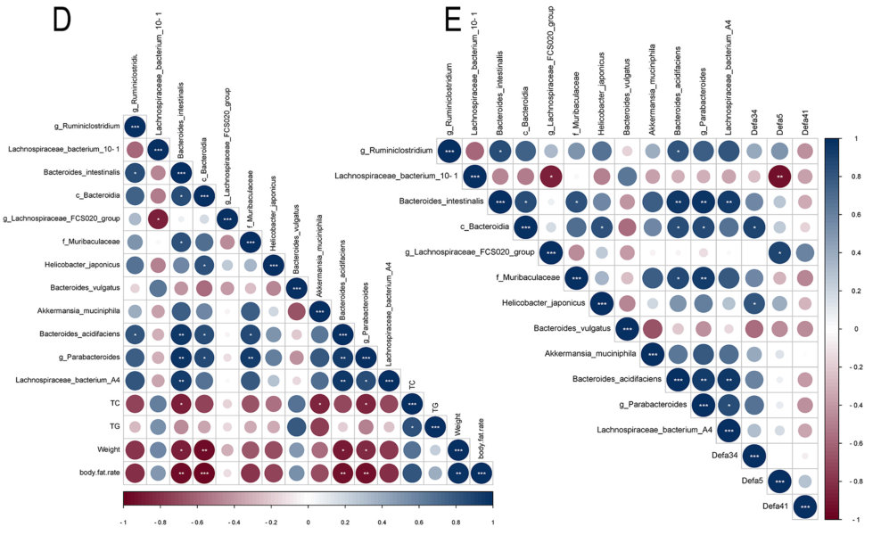 EA促進了腸粘膜免疫中3個代表性基因Defa5、Defa20和Defa41的表達,其中Defa5顯著上調(圖6A);EA還恢復了這些防御素的蛋白質水平,其中Defa5和Defa41顯著增加(圖6B)。斯皮爾曼相關系數(shù)分析結果顯示,Defa5和Defa34的蛋白質水平與關鍵肥胖指數(shù)呈負相關,包括體重、體脂百分比以及甘油三酯TG、總膽固醇TC含量(圖6C);,EA下調 Lachnospiraceae bacterium_10_1和 Bacteroides acidifaciens物種的相對豐度,與肥胖小鼠的關鍵肥胖指數(shù)呈正相關(圖6D);EA調節(jié)的腸道防御素表達與幾種腸道菌群相關(圖6E)。以上結果表明,腸道防御素的調節(jié)是EA拯救肥胖小鼠腸道微生物群的關鍵機制之一。