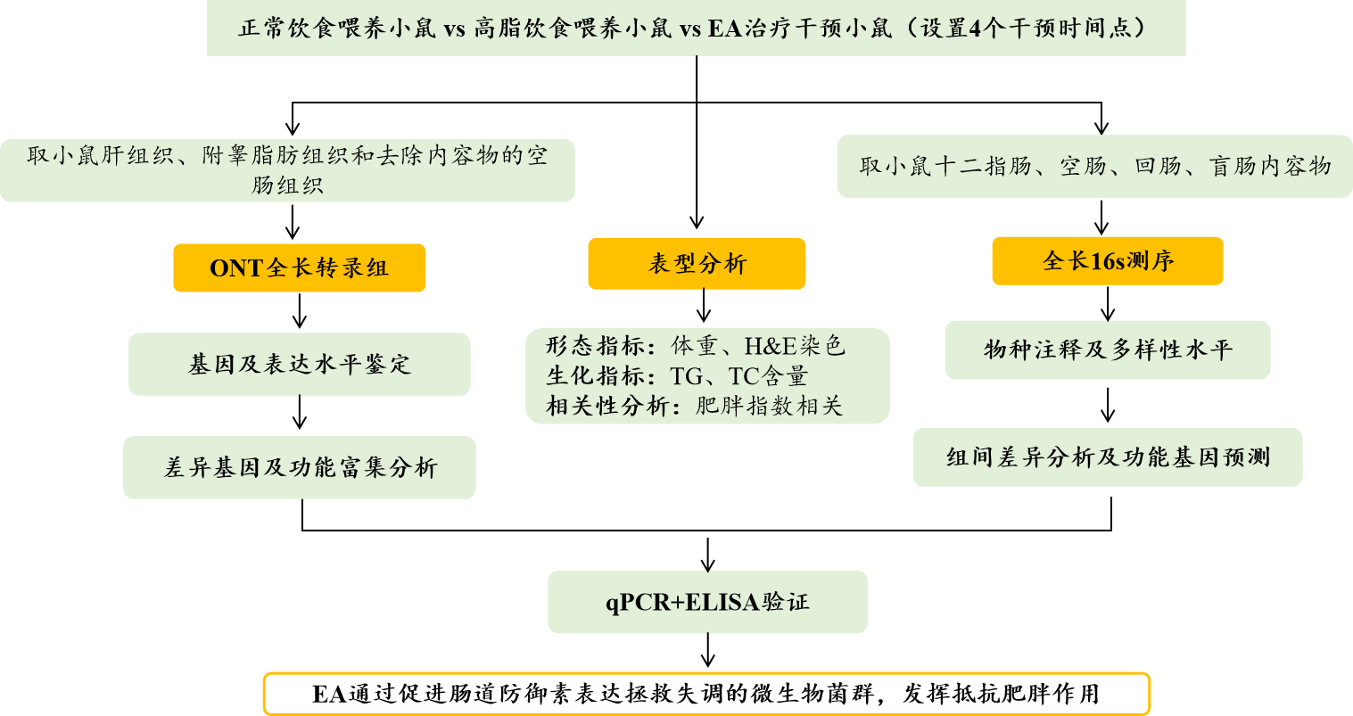 肥胖作為一種不斷增長的非傳染性流行病,影響了超過20億人。腸道微生物菌群失調已被證明是肥胖和肥胖相關疾病發(fā)生和進展的關鍵因素,包括高血壓、II型糖尿病、血脂異常和非酒精性脂肪性肝?。∟AFLD)。針灸已被廣泛用于治療肥胖癥,研究報道,電針(EA)可以減輕肥胖小鼠的體重,挽救生態(tài)失調的腸道微生物群,還可以調節(jié)免疫力。然而,EAEA重塑腸道微生物群的潛在機制尚不清楚,如何通過腸道微生物菌群調節(jié)腸道先天免疫力對抗肥胖仍有待闡明。