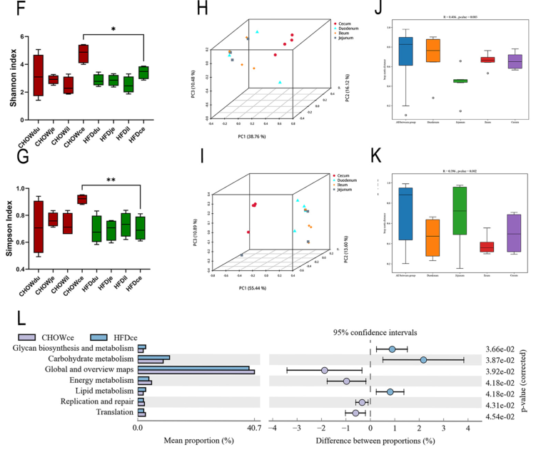 α多樣性分析結果顯示,高脂飲食HFD組與正常對照組的十二指腸、空腸和回腸微生物多樣性沒有顯著差異,但在盲腸中HFD組微生物多樣性顯著減少(圖1F, 1G);β多樣性分析結果顯示,與其他腸道段相比,只有盲腸微生物菌群在HFD組與正常對照組表現(xiàn)出顯著差異(圖1H, 1I);此外,top 15的KEGG通路中有7個是基于微生物功能富集,高脂飲食組盲腸微生物的上調通路包括脂質代謝、碳水化合物代謝和聚糖生物合成和代謝,下調通路包括能量代謝相關途徑(圖1L)。