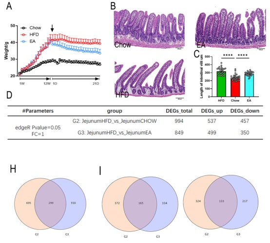 相較于HFD組,EA組顯示出顯著地減肥效果(圖2A),并減少了附睪、腎臟和腹股溝區(qū)域的脂肪堆積??漳c是腸道脂質消化和吸收的主要區(qū)域,HFD小鼠的空腸絨毛明顯長于食物組(圖2B, 2C)。HFD組和正常對照組間共鑒定出994個差異表達基因DEG(圖2D-F),HFD組和EA組共鑒定出849個DEG(圖2G);通過取兩個比較組共有的DEG,作為EA直接調控肥胖的DEG,共檢測到共有基因299個,其中上調的有165個,下調的有133個(圖2H-J)。