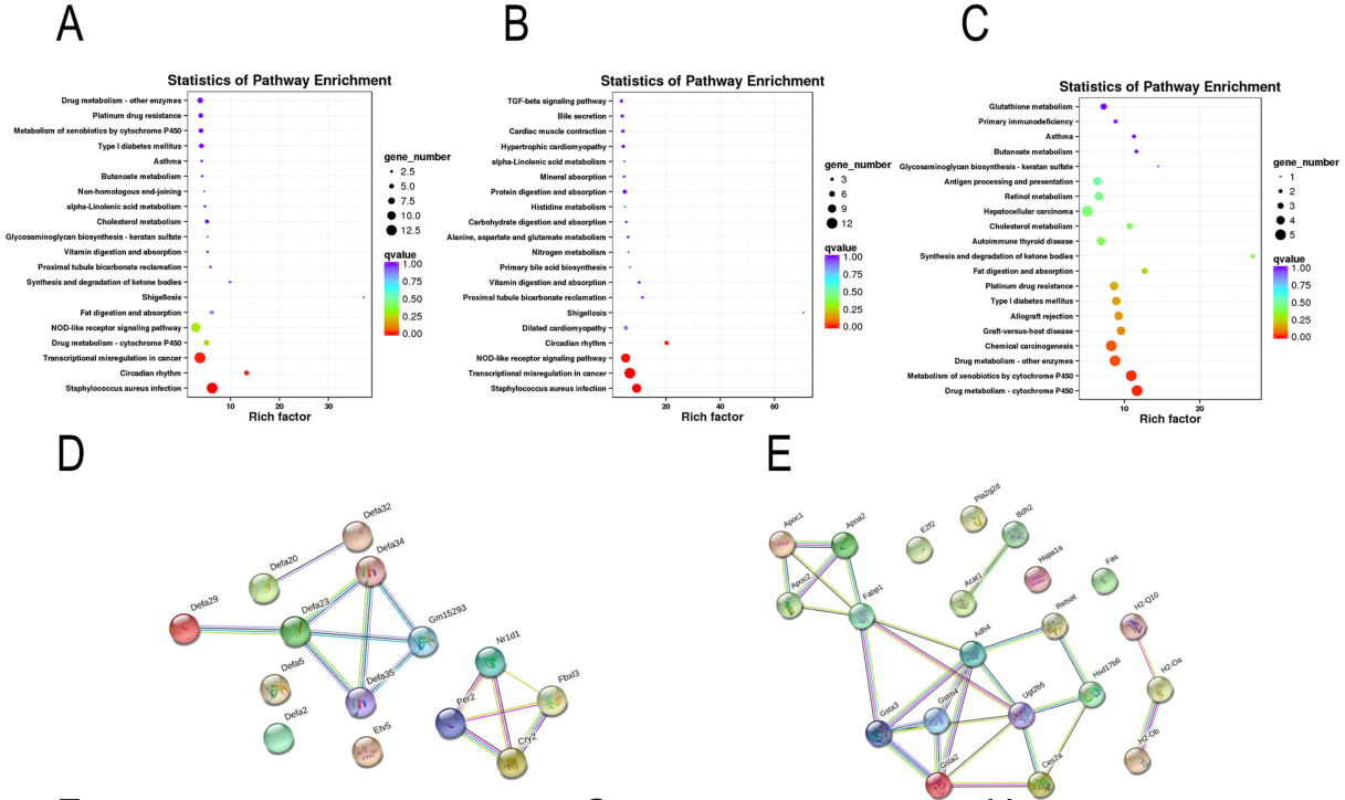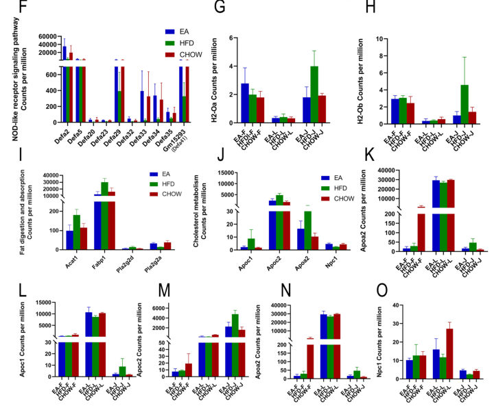 對共有DEG進行功能富集分析,發(fā)現(xiàn)顯著富集的通路主要與宿主先天防御和脂質代謝相關(圖3A);在去除功能未鑒定的基因或lncRNA后,獲得140個上調和92個下調的DEG也進行功能富集分析(圖3B, 3C);然后,對top20通路的DEG進行PPI調控網絡分析(圖3 D, 3E),結果顯示,EA主要上調的通路包括α防御素基因在內的NOD樣受體信號通路(圖3 D),下調的通路脂質代謝(包括脂質消化和吸收途徑),以及免疫應答相關通路(谷胱甘肽s-轉移酶和MHC II類相關基因)(圖3E)?;虮磉_直方圖顯示EA干預恢復大量異常表達的DEG,與腸粘膜免疫相關的DEG,如α防御素基因,可以通過EA顯著恢復(圖3F);與免疫反應相關的H2-Ob和H2-OA僅在空腸區(qū)域下調(圖3G, 3H);EA干預恢復了fabp1、pla2g2d和acat1的表達水平,主要負責脂肪消化和吸收(圖3I);最后,EA干預通過下調apoc1、apoa2和apoc2以及上調npc1來調節(jié)膽固醇代謝(圖3J-O)。