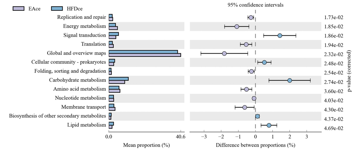 在EA干預21天后,HFD組中盲腸微生物組成被顯著恢復(圖4 A&B),α多樣性(圖4 C, 4D)和β多樣性恢復(圖4E-G);通過LEfSe分析鑒定了9種特征細菌(圖4H);跟蹤EA處理3、7、14和21 d相對豐度的時間序列變化,篩選到肥胖小鼠盲腸10個相關物種,其中8個上調,包括G. Ruminiclostridium和 A. muciniphila;Tax4Fun預測了EA和HFD組間具有顯著差異的13種KEGG通路;并且,EA干預能有效地下調脂質代謝途徑,上調能量代謝途徑(圖5)。