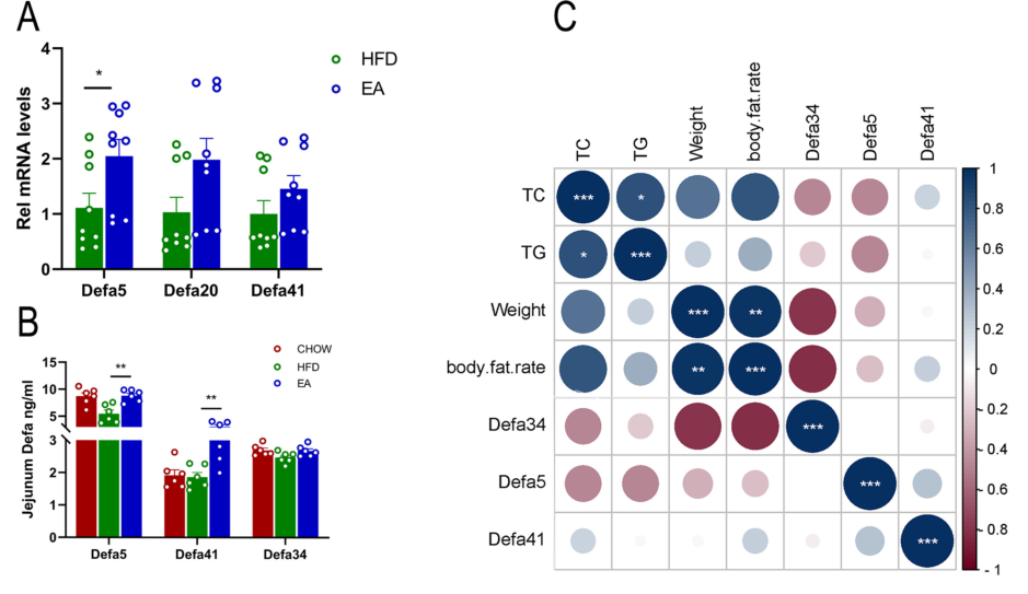 4. Defa5水平與毛螺菌科呈正相關,與肥胖指標呈負相關,EA還可以減少組織炎癥,改善葡萄糖耐量異常,并抑制腸道脂質吸收的關鍵基因。