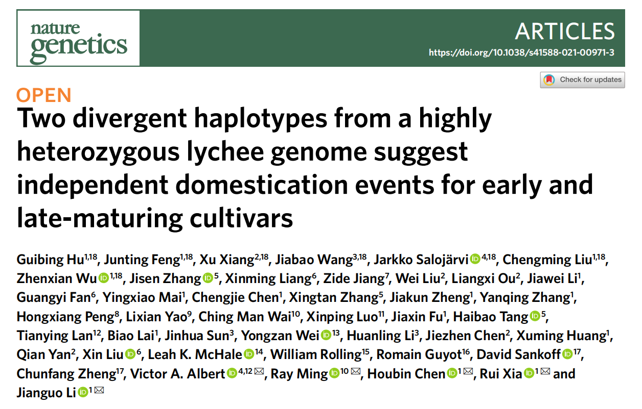 研究?jī)?nèi)容:基于荔枝(Litchi chinensis)基因組的高度雜合(~2.27%),構(gòu)建了兩套高質(zhì)量“妃子笑”單倍型基因組(470 Mb)。72份荔枝重測(cè)序分析發(fā)現(xiàn),來(lái)自云南的一個(gè)野生群體的極早熟荔枝品種主要與“妃子笑”的其中一個(gè)單倍型對(duì)應(yīng);來(lái)自海南的一個(gè)野生群體的晚熟荔枝品種則與另外一個(gè)單倍型對(duì)應(yīng)。早熟荔枝品種可能是極早熟荔枝品種與晚熟荔枝品種的雜交形成的,在廣東培育而成。包含一對(duì)CO-like基因的3.7kb序列的缺失變異可能調(diào)控著不同荔枝品種間的果實(shí)成熟差異。