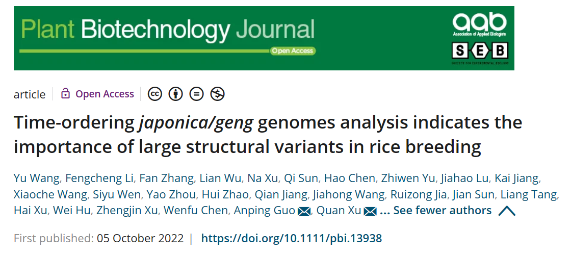 研究?jī)?nèi)容:基于Nanopore平臺(tái)構(gòu)建了12個(gè)高質(zhì)量水稻基因組(contigN50 8.77-15.84Mb)。通過(guò)全基因組比對(duì)分析找尋大量的結(jié)構(gòu)變異(SVs),發(fā)現(xiàn)SV相關(guān)基因可能在葉綠體膜系統(tǒng)中發(fā)揮重要作用,顯性LTG1的水稻品種比具有其他類(lèi)型等位基因的水稻品種更耐低溫,說(shuō)明LTG1在調(diào)節(jié)水稻耐寒性中起著關(guān)鍵作用。豐富的基因CNVs是水稻遺傳多樣性的一個(gè)重要特征,研究發(fā)現(xiàn)GNP1的拷貝數(shù)變異(CNVs)可能與水稻粒數(shù)相關(guān)。本研究為擴(kuò)寬粳型栽培稻的遺傳多樣性、進(jìn)一步提升育種潛力提供遺傳基礎(chǔ)。