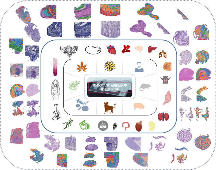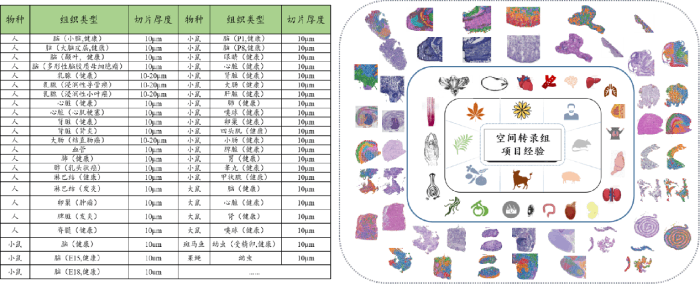 空間轉錄組從組織切片、染色到組織透化的實驗過程,也直接關系到分析數據的質量,百邁客實驗人員經過大量的項目積累,創建了動植物組織優化標準體系,保證組織優化結果準確判讀,可提供高質量的報告數據,目前實測組織類型100+種,包括人、小鼠、大鼠、果蠅、牛等物種的腫瘤樣本、胚胎樣本、肝臟樣本、肺部樣本、腦部樣本等組織類型,尤其是突破了動物血管、軟骨、皮膚類組織的切片、透化難點,為高質量數據分析提供了保障。