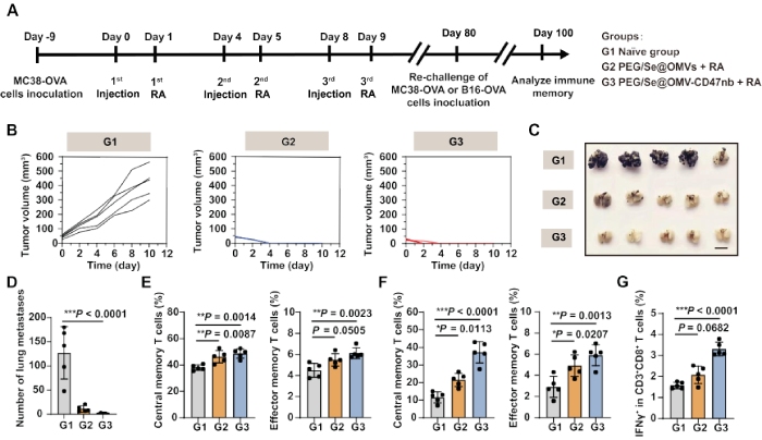 為了確定通過輻射觸發的OMV-CD47nb傳遞是否能激活免疫記憶,對構建好的PEG/Se@OMVs+RA、PEG/Se@CD-CD47nb+RA處理的MC38-OVA和B16-OVA皮下成瘤小鼠進一步分析(圖4A)。結果顯示,PEG/Se@OMVs+RA和PEG/Se@CD-CD47nb+RA處理的MC38-OVA小鼠腫瘤沒有生長,達到100%的腫瘤抑制率(圖4B),但PEG/Se@OMVs+RA和PEG/Se@CD-CD47nb+RA處理的B16-OVA組分別達到了 91.2%和98.2%的肺部轉移抑制率(圖4C, D);與對照組相比,PEG/Se@OMVs+RA和PEG/Se@CD-CD47nb+RA治療得小鼠血液和脾臟的中央記憶型T細胞和效應記憶T細胞比例顯著上調(圖4E, F);PEG/Se@OMVs+RA組中記憶T細胞比例略高于PEG/Se@CD-CD47nb+RA組,這與B16-OVA細胞的肺轉移抗腫瘤效果一致(圖4D);PEG/Se@OMVs+RA和PEG/Se@CD-CD47nb+RA處理的小鼠脾臟細胞仍然擁有識別腫瘤抗原的能力,表現為OVA抗原重新刺激上調CD3+CD8+T細胞中IFNγ+細胞的比例(圖4G)。以上結果表明,PEG/Se@CD-CD47nb+RA治療誘導腫瘤抗原特異地適應性免疫,激活了腫瘤抗原的免疫記憶,提供了長期的腫瘤預防效果。