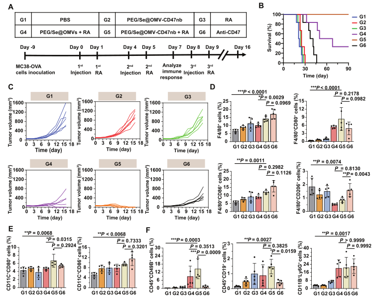 分別構建PBS、PEG/Se@OMV-CD47nb、RA(局部放射治療)、PEG/Se@OMV+RA、PEG/Se@OMV-CD47nb+RA、anti-CD47處理的MC38-OVA皮下成瘤小鼠模型(表達卵清蛋白的MC38小鼠結腸癌細胞系),評估抗腫瘤效果(圖2A)。結果顯示,90天后,PEG/Se@OMV-CD47nb+RA組小鼠存活率100%,PEG/Se@OMV+RA組小鼠存活率33.3%,其余組小鼠均全部死亡(圖2B);單獨RA與PEG/Se@OMV-CD47nb處理沒有引起明顯的抗腫瘤活性,而RA與PEG/Se@OMV-CD47nb聯合顯示出顯著的抗腫瘤效果,但并且與臨床上使用的陽性對照anti-CD47相比,CD47nb的抗腫瘤作用更強(圖2C)。
