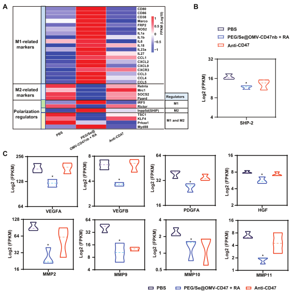 利用FACS分選出PBS、PGE/Se@OMV-CD47nb+RA和anti-CD47處理的皮下成瘤小鼠的瘤內巨噬細胞,進行RNA-seq。分析結果顯示,與PBS組相比,PGE/Se@OMV-CD47nb+RA組M1型巨噬細胞maker基因表達水平上調,包括:CD80、CD86、CD38、Marco、FPR2、NOS2、IL-1α、IL-1β、IL-6、IL-18、IL-23a、IL-27、CCL1、CXCL2、CXCL9、、CXCR3、CCL3、CCL4和CCL5,M2型相關的marker基因表達水平下調,包括:Rentla、Mrc1、SOCS2和Ppard,提示與M1型相關趨化因子的表達增加可能是招募免疫細胞進入TEM的原因;PGE/Se@OMV-CD47nb+RA組中M1型極化相關的轉錄因子IRF-5和Myd88表達水平上調,M2型極化相關的轉錄因子Rictor、TSC1、Klf4和Prkaa1表達水平下調(圖3A); 相較PBS組,PGE/Se@OMV-CD47nb+RA和anti-CD47組中CD47-SIRPα信號通路下游分子SHP2表達水平下調,可能與CD47的阻斷作用有關(圖3B)。