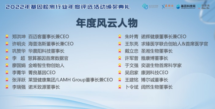 會上,百邁客生物董事長兼CEO鄭洪坤先生在基因檢測行業(yè)“年度風云人物”評選中率先當選。