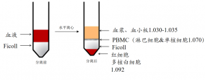 外周血單核細胞(Peripheral blood monoculear cell, PBMC)中大部分都是淋巴細胞(包括B細胞和T細胞),以及少部分的自然殺傷細胞和單核細胞,而紅細胞和血小板沒有細胞核,而粒細胞(granulocytes) 包括中性粒細胞、嗜堿性粒細胞和嗜酸性粒細胞,有多葉核,所以不包括在PBMC中。PBMC的制備采用密度梯度離心法,可通過Ficoll作為密度梯度介,使得不同密度的細胞在對應的界面處,然后通過快速離心,實現細胞分離。