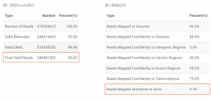 (1)數據相關統計:新增有效reads數及占比、基因反義鏈比對率