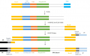 接下來進入單細胞測序的第三環節–文庫構建。文庫構建可分為三個部分:DNA片段化/末端修復/添加A尾、接頭連接和Index PCR(PCR富集)。